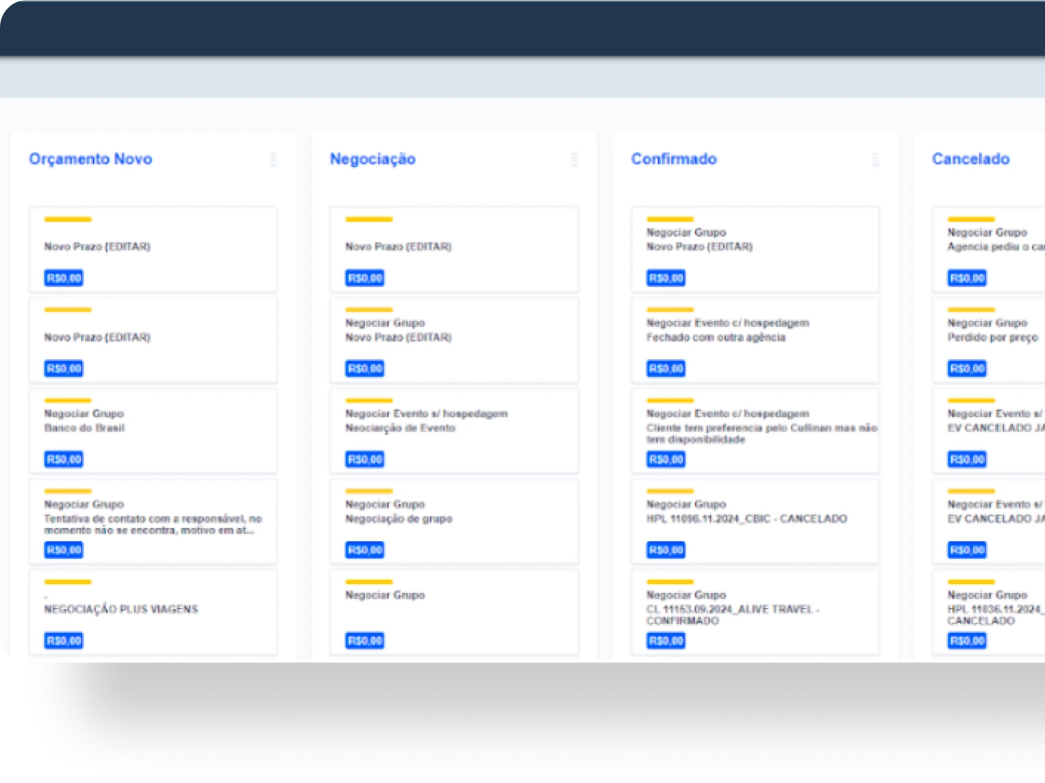 A plataforma inclui ferramentas dedicadas para gerenciar oportunidades de grupos, eventos e conferências, automatizando o processo de vendas, cartas acordos, RFPs e fechamento de contratos, recursos pouco explorado em CRMs padrão.
